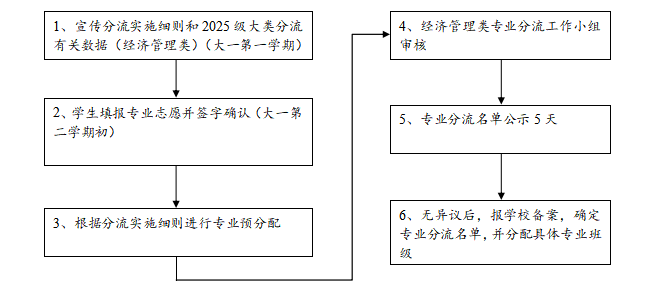 经济管理类专业分流工作从大一第二个学期四月份开始(具体时间以本科生院的通知为准),流程如下: