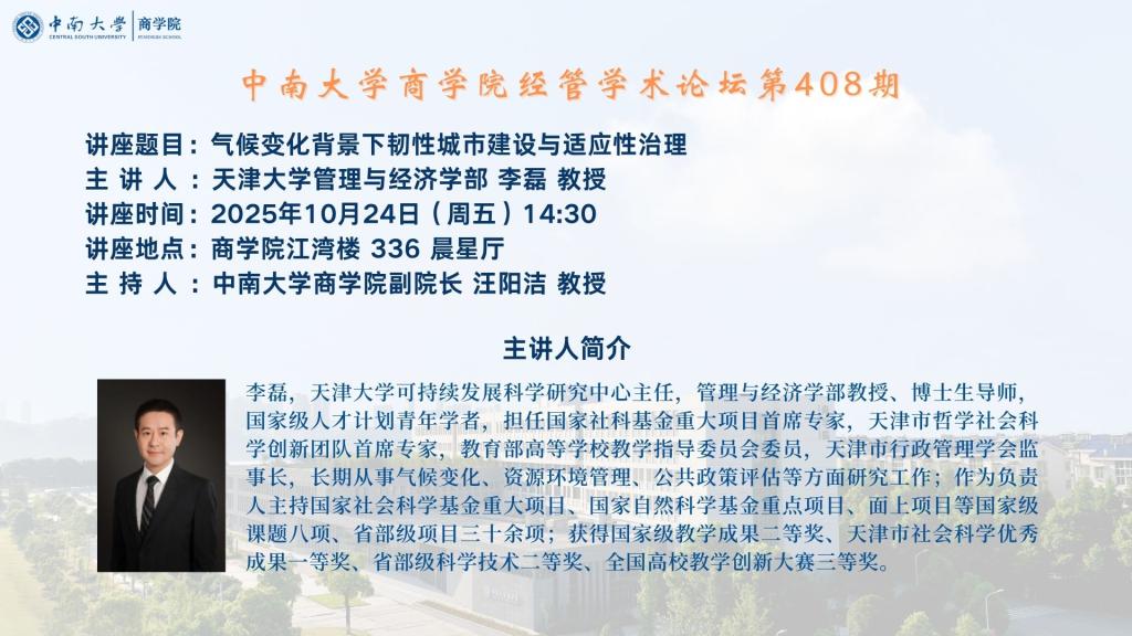 中南大学商学院经管学术论坛第408期——天津大学管理与经济学部 李磊 教授