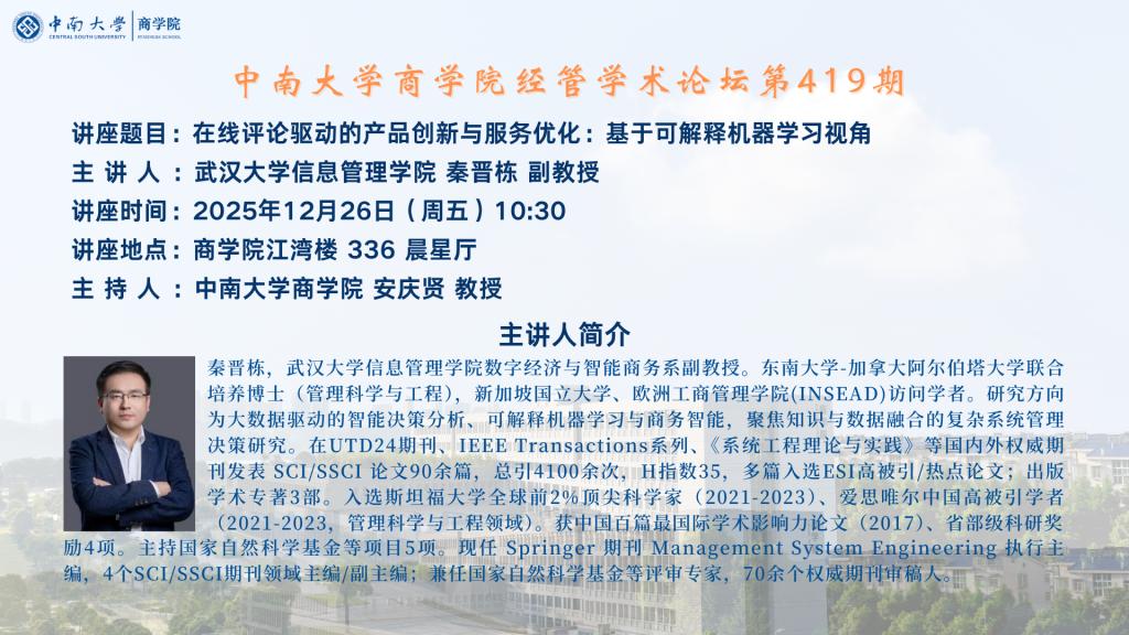 中南大学商学院经管学术论坛第419期——武汉大学信息管理学院 秦晋栋 副教授