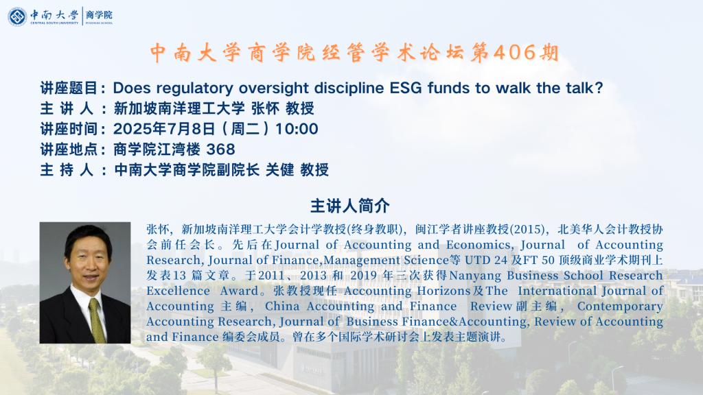 中南大学商学院经管学术论坛第406期——新加坡南洋理工大学 张怀 教授