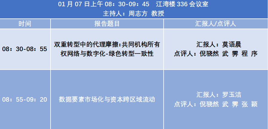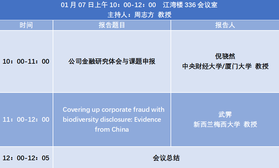 会议安排:研讨会由莫语晨、罗玉洁、金梦萱三位同学汇报交流小论文,中央财经大学/厦门大学教授倪骁然老师分享公司金融研究体会与课题申报,新西兰梅西大学教授武霁老师分享Covering up corporate fraud with biodiversity disclosure: Evidence from China。