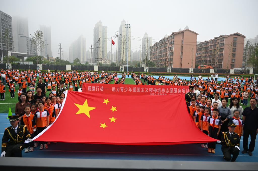 9月29日,晨光初透,湖南湘江新区岳麓实验谷山小学的操场上,一面长5米、宽3.3米的巨幅国旗在师生注目下缓缓展开。这面由北京市人民政府天安门地区管理委员会赠予中南大学、曾于2010年在天安门广场冉冉升起的国旗,而今成为连接大学与小学、历史与未来的精神纽带。