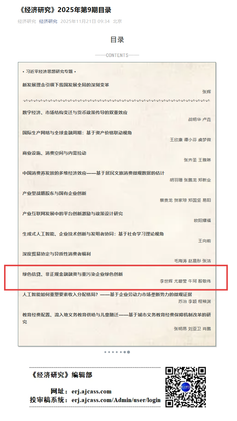 近日,我院会计与财务系李世辉教授(第一作者)、殷敬伟副教授(通讯作者)、尤碧莹博士研究生、牛珂硕士研究生合作论文“绿色信贷、非正规金融融资与重污染企业绿色创新”在《经济研究》期刊2025年第9期正式发表。该研究揭示了以影子银行为代表的非正规金融在缓解重污染企业正规金融信贷约束、促进重污染企业绿色创新方面的重要作用。论文第一作者单位及通讯作者单位均为中南大学商学院。