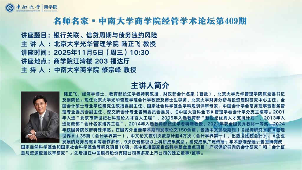名师名家▪中南大学商学院经管学术论坛第409期——北京大学光华管理学院 陆正飞 教授
